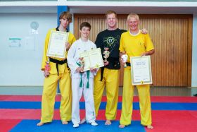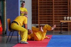 Trainer Stefan Schäfer absolvierte hier seinen 6. Meistergrad und ist somit zum Großmeister ernannt worden. Um diesen Titel zu erlangen musste er an mehreren Prüfungen teilnehmen - u.A. einen Freikampf mit drei Gegnern und eine Griffbefreiung mit verbundenen Augen. Stefan Schäfer bestritt alle Teilprüfungen mit großem Erfolg und viel Körpereinsatz. (Bild 1)